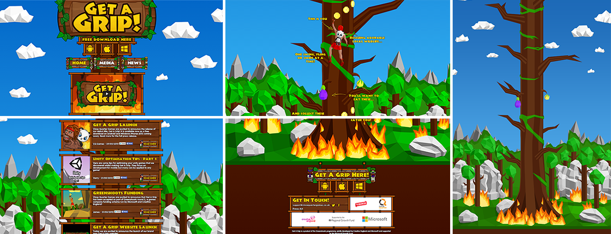 This website was designed as a 2d representation of gameplay whilst advertising the product and it's development. As the user scrolled down the homepage they would be presented with preset scenes detailing gameplay features. A series of repeatable textures and re-usable assets could be arranged to populate an endless tree for the varying page heights.