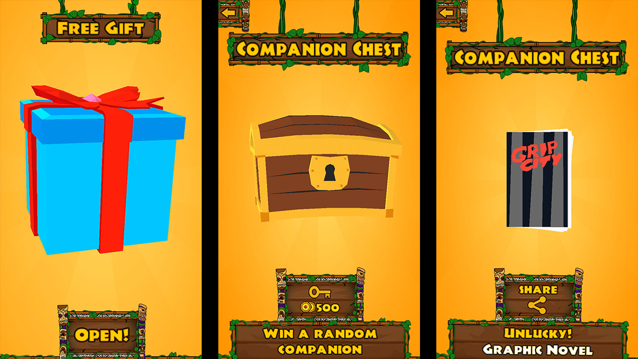 Content re-colouring, unique environment assets, sounds effects, and visual gameplay modifications were used as additional rewards for unlocking items and characters. Items served as player chosen equipment providing gameplay mechanics and passive bonuses to be experimented with and combined for synergistic results.