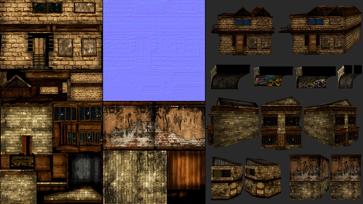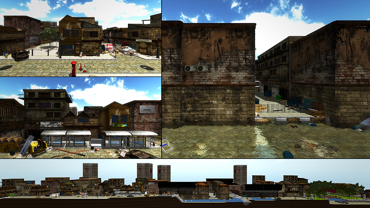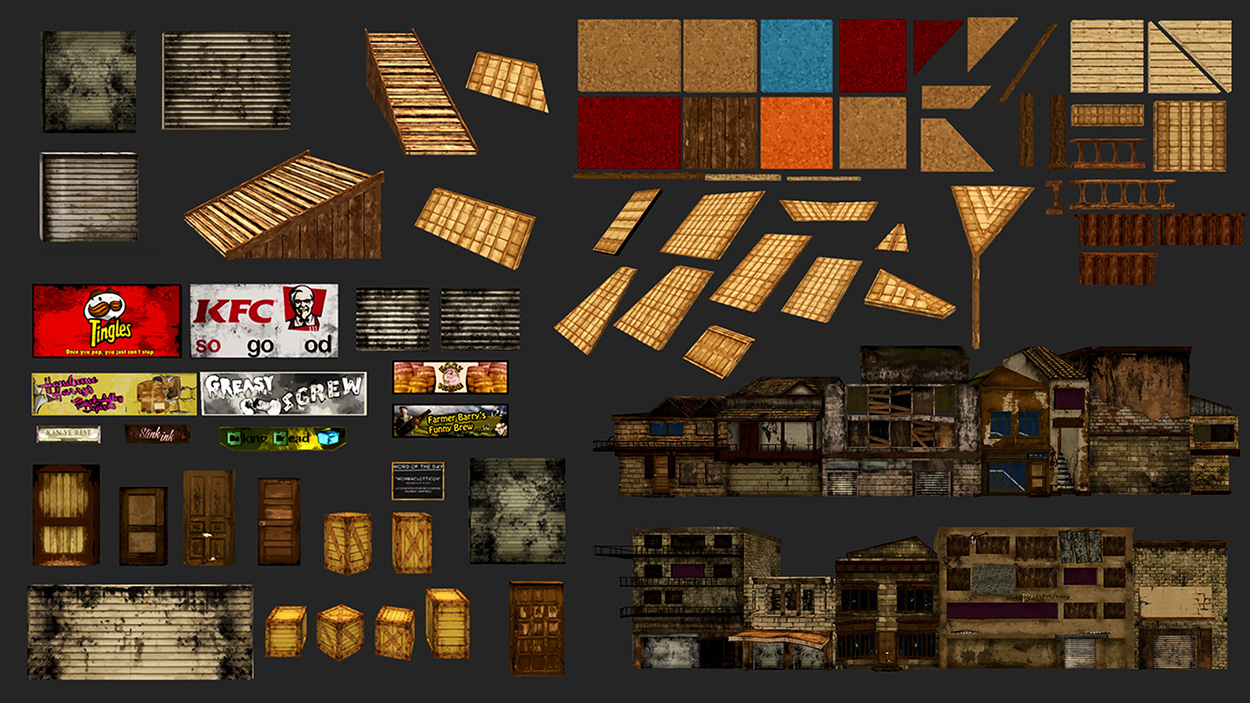 Hundreds of other assets such as weapons, buildings, bridges, props, signs, and vegetation were also created to populate the world. You can see a small sample of these below.