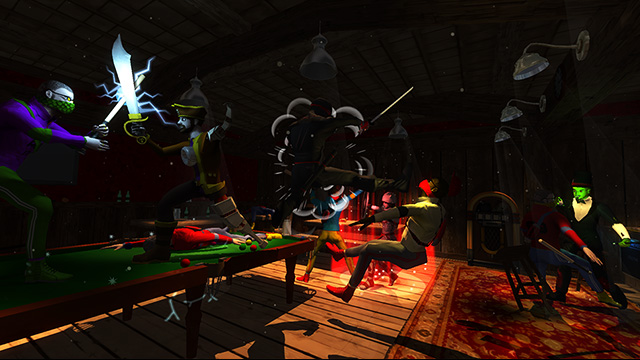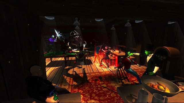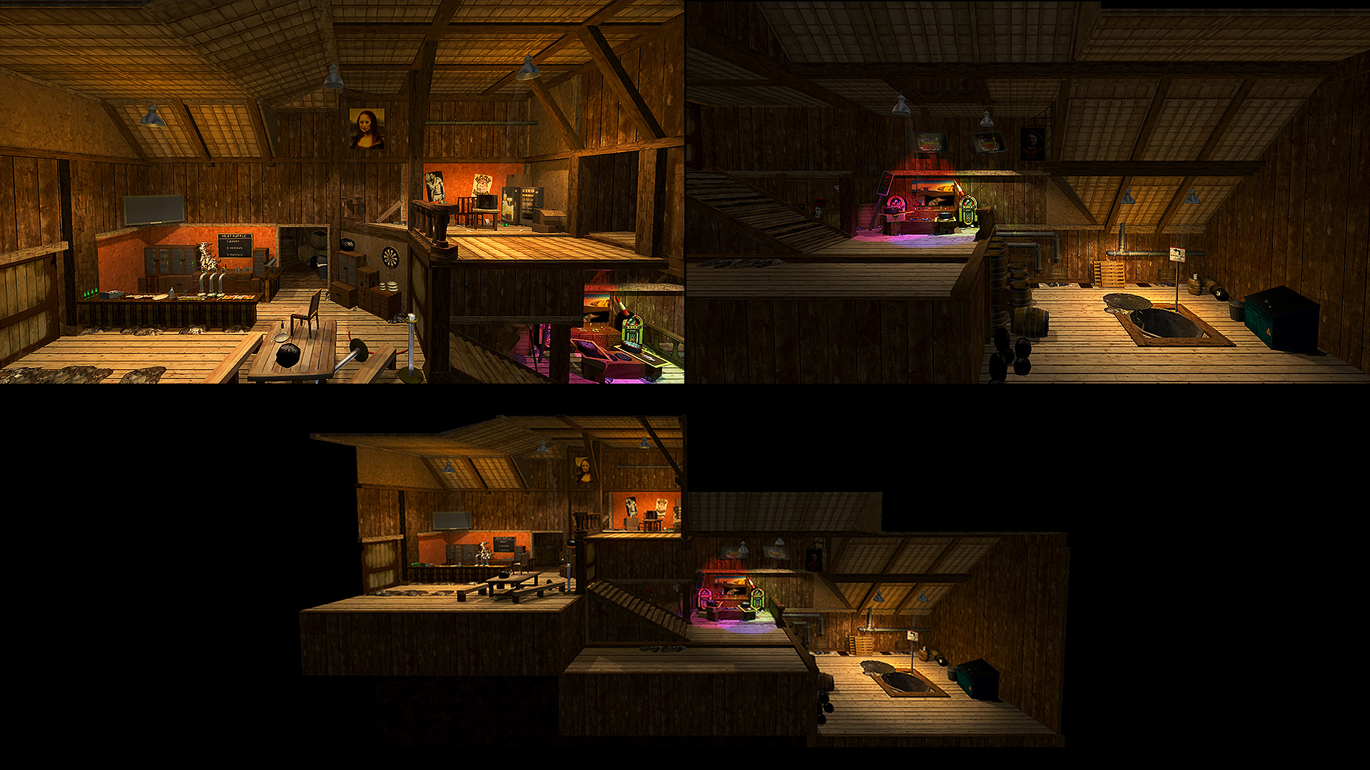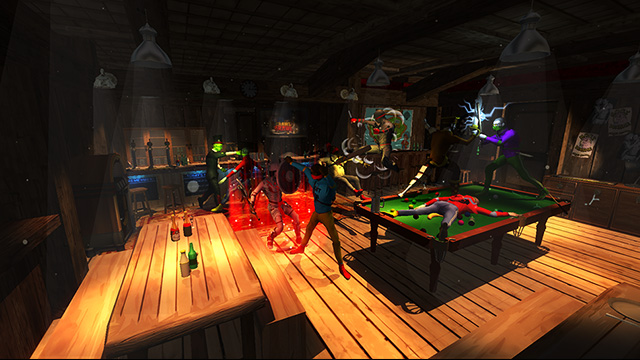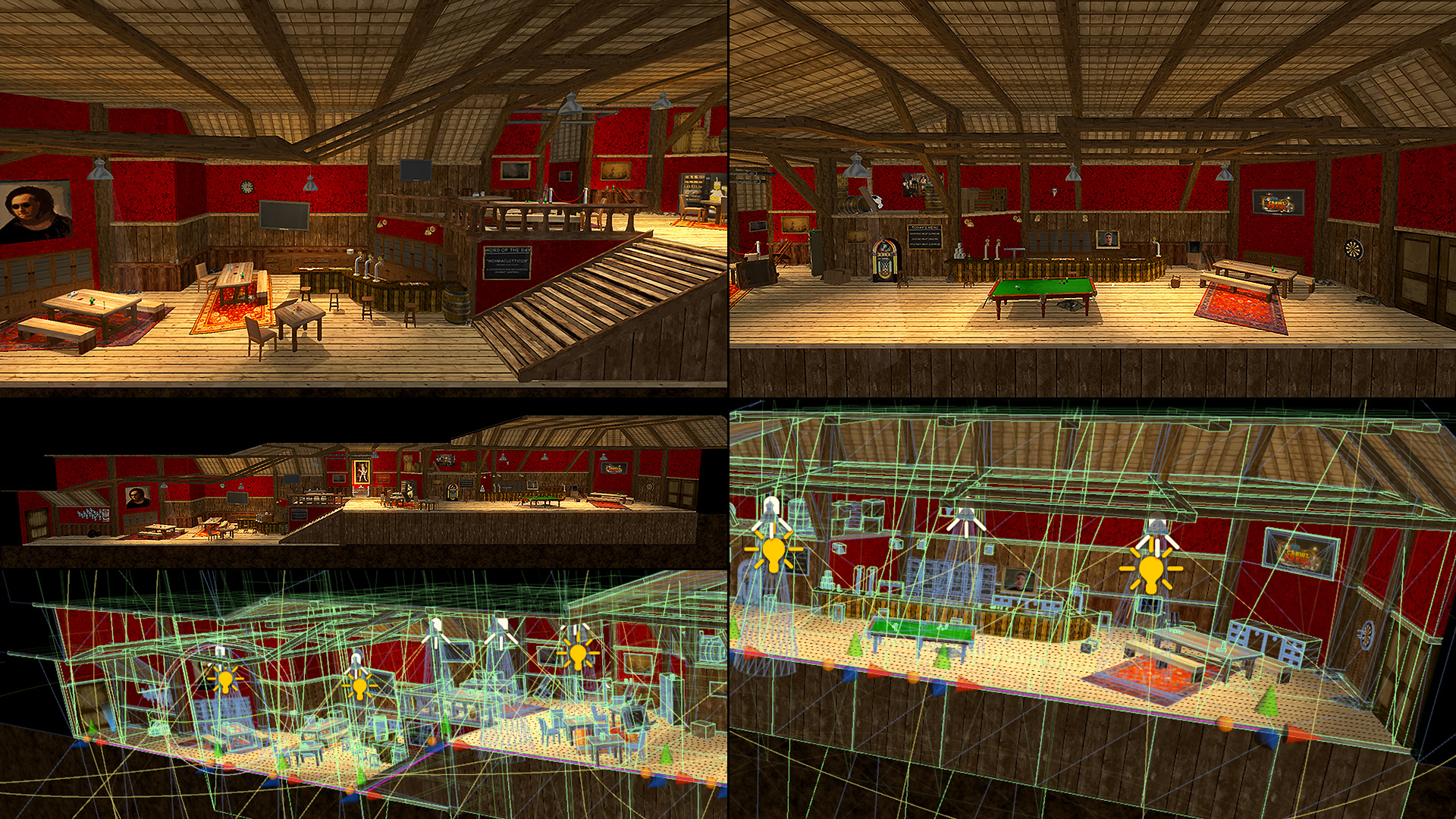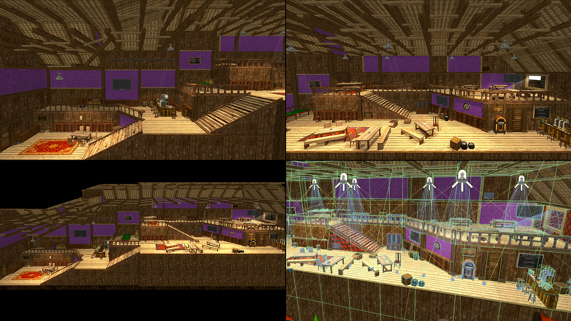 Interior pub levels acted as non-combat breathers breaking up the hectic combat levels. A snappable modular kit composed of interlocking walls, floors, doors, beams, and stairs created the pub foundation before prop assets, proximity audio cues, lights, and fog were then added on top.