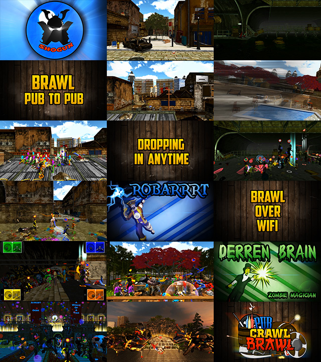 A university module had us group up into a team of five and create a full working game... So, Pub Crawl Brawl is a 3d side-scrolling beat-em-up game where, naturally, you complete a pub crawl! You battle pub-to-pub alongside your friends against hordes of street scum through drop-in-and-out local co-op for 1-100 (yes, one hundred!) simultaneous players. Players connect and control their characters over Wi-Fi through a companion controller smartphone app that connects to the host computer.